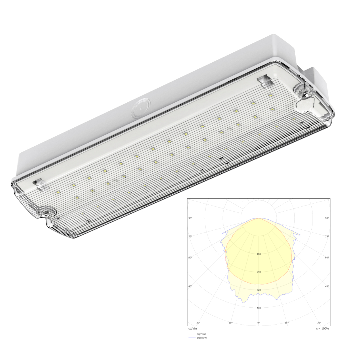Светодиодный накладной светильник с аккумуляторной батареей в белом пылевлагозащищенном корпусе IP65 с прозрачным рассеивателем для аварийного эвакуационного освещения открытых пространств и путей эвакуации.