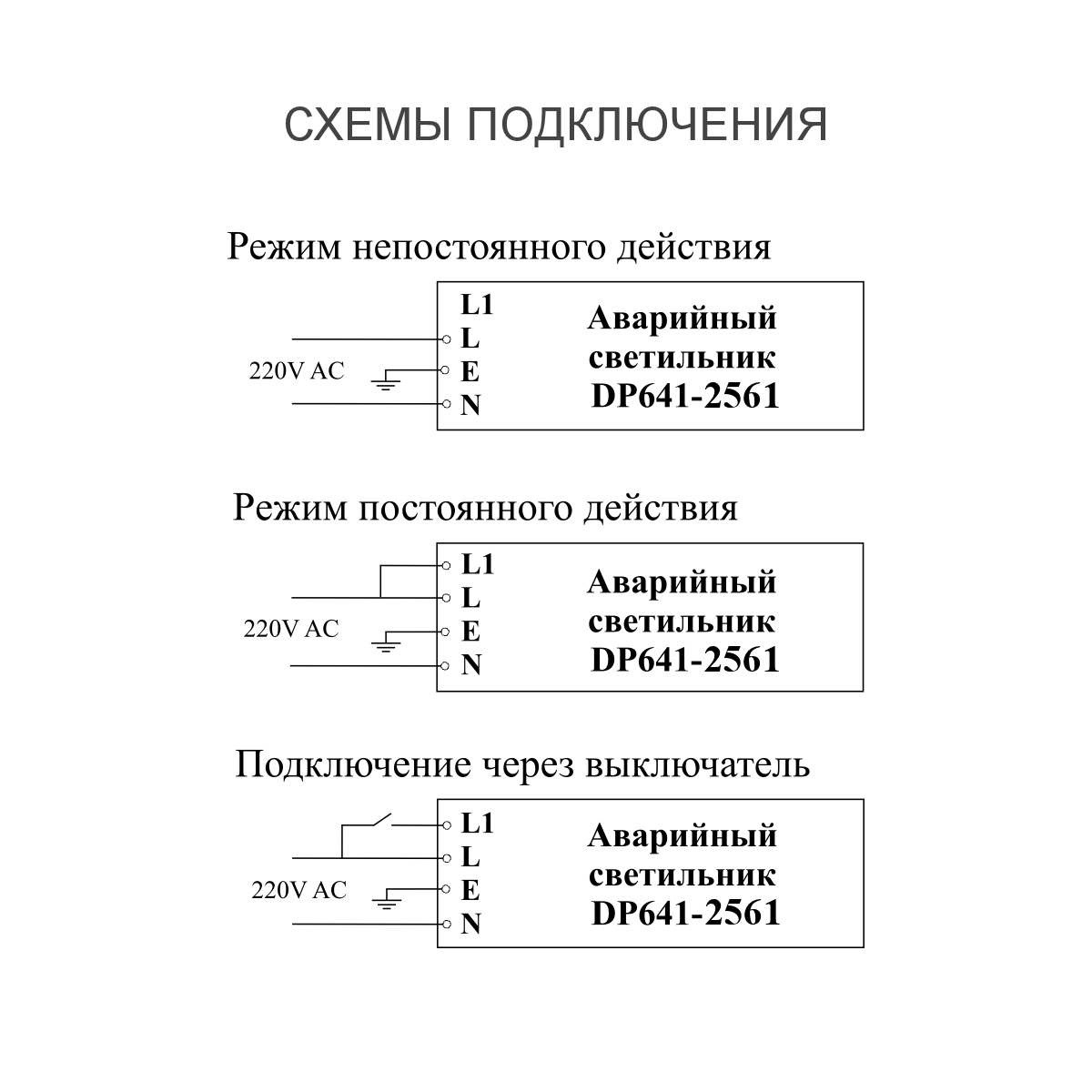 Для всех вариантов подключения: в случае пропадания напряжения на клемме L накладной светодиодный светильник автоматически переключится в аварийный режим работы от собственной аккумуляторной батареи. В аварийном режиме светодиодный модуль всегда светится.