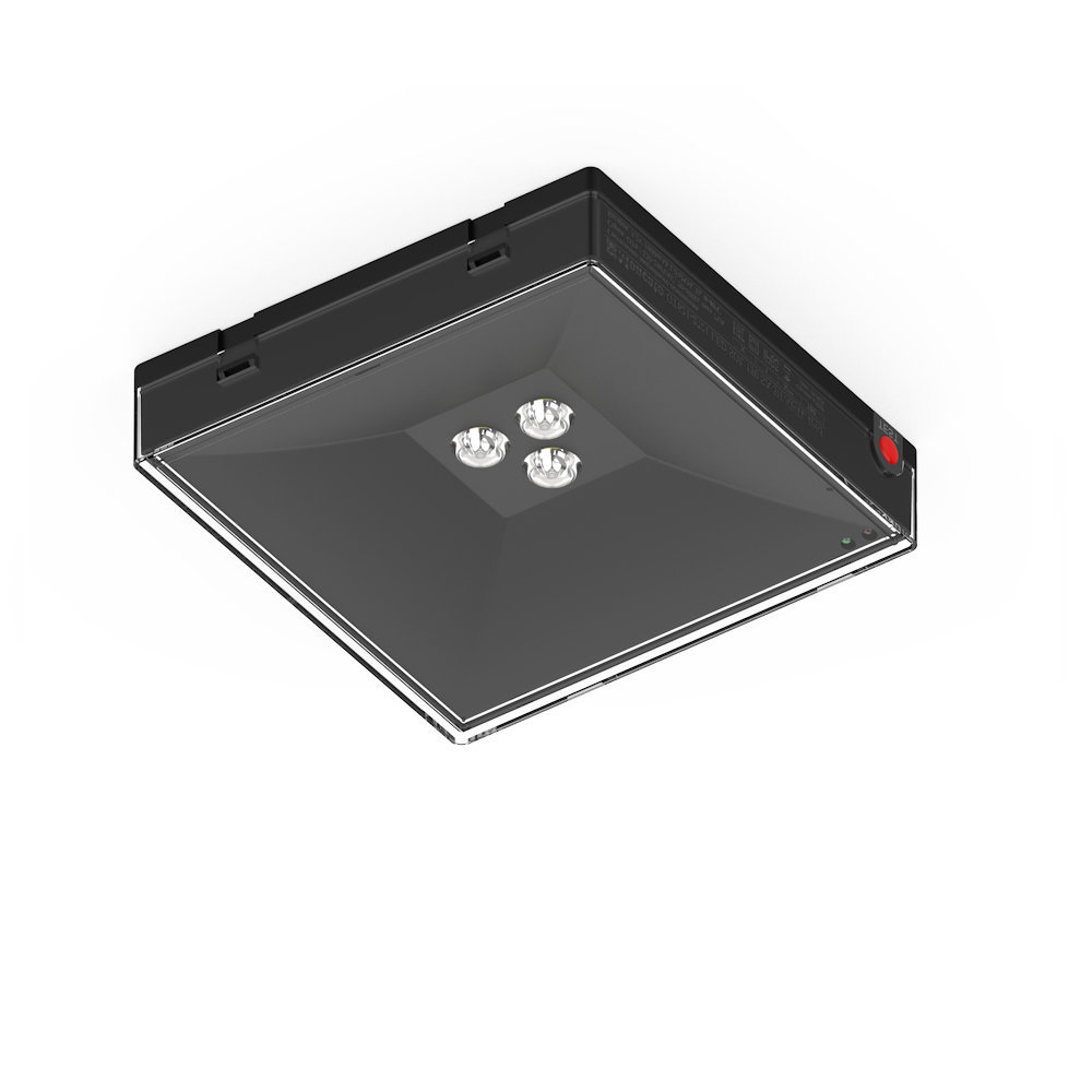 Квадратный потолочный светильник в узком компактном корпусе черного цвета для аварийного освещения открытых пространств и эвакуационных проходов.