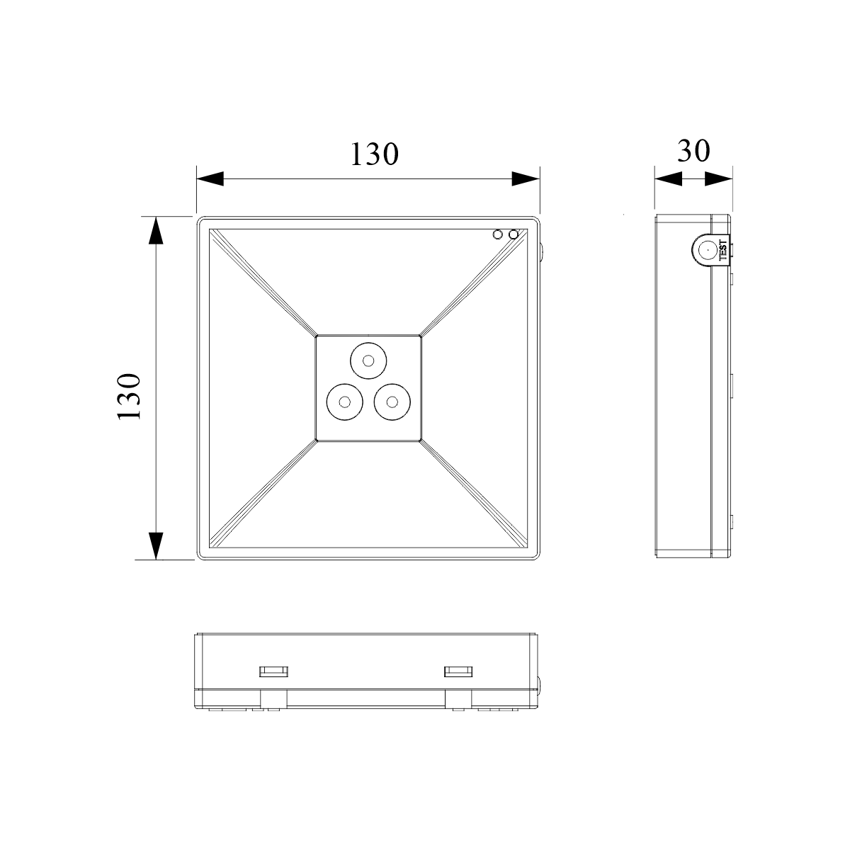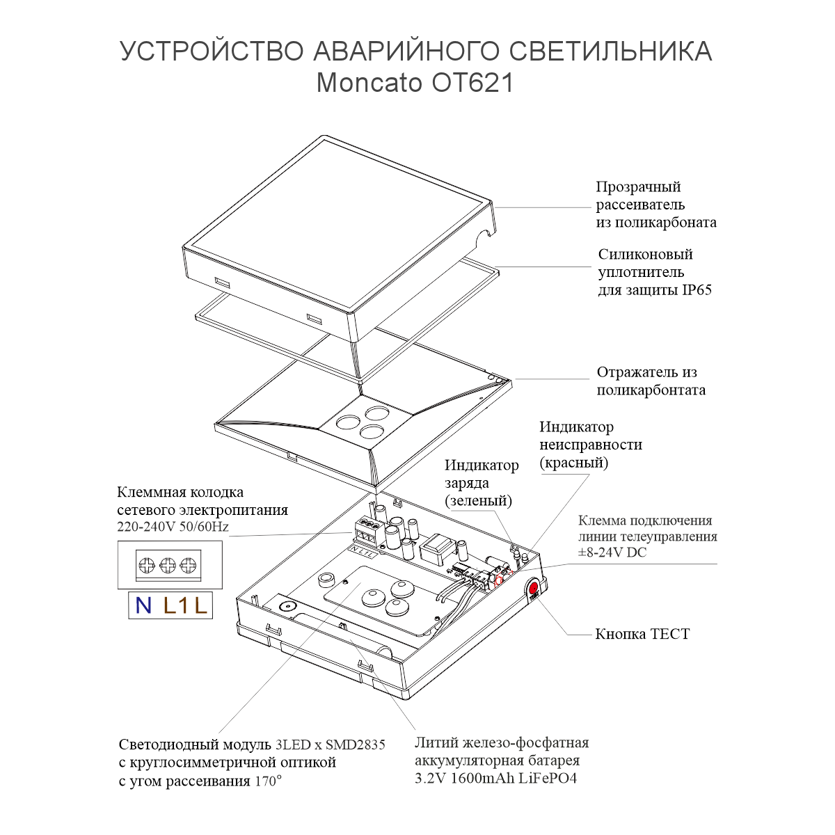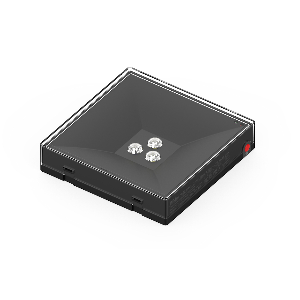 Аварийный светильник Moncato OT621 SOL IP65 BLACK — это компактное квадратное устройство размером 130×130×30 мм. Корпус и отражатель выполнены из черного негорючего ударопрочного поликарбоната. Внутри расположены электронная плата, LED-модуль с тремя светодиодами SMD2835 и аккумуляторная батарея.