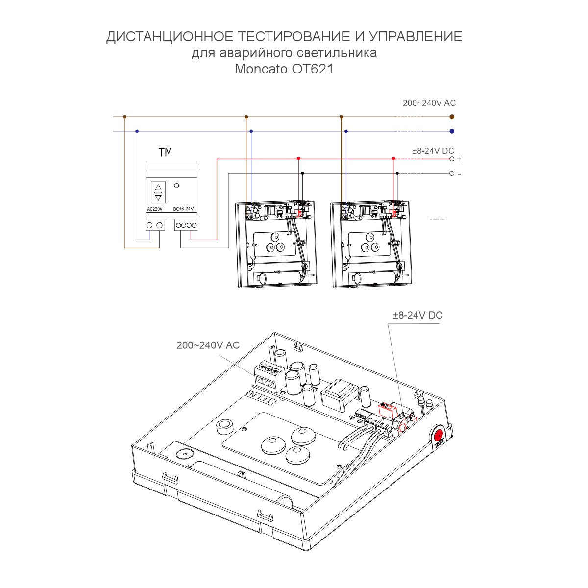 - TL (дистанционное тестирование по выделенной линии телеуправления ±8~24V DC) Светодиодная индикация: Зеленый (заряд); Красный (неисправность)