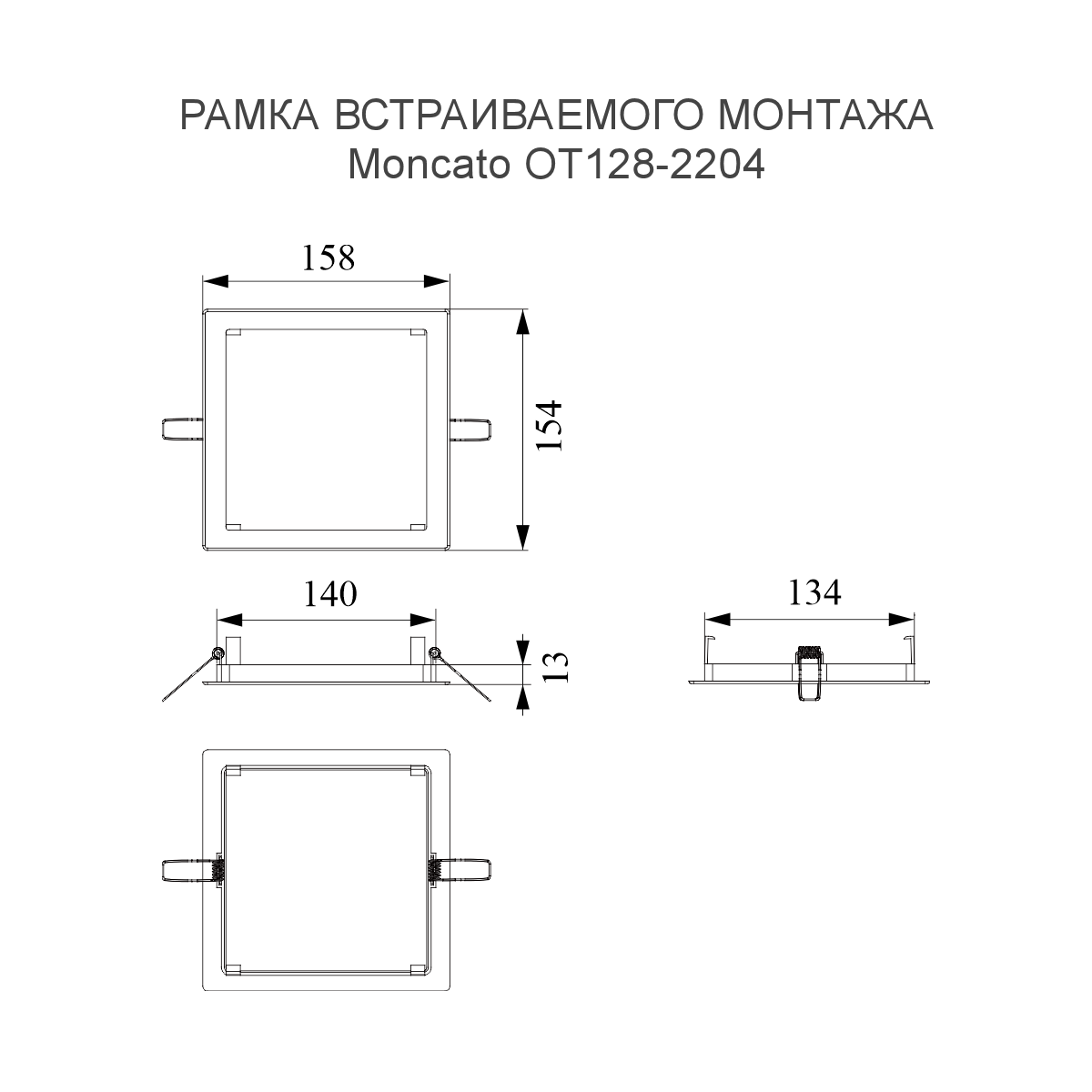 Встраиваемый монтаж осуществляется с использованием дополнительной рамки черного цвета (код для заказа OT128-2210). Рамка крепится в отверстии потолка при помощи пружинных креплений. Размер врезного отверстия - 140х150мм. Внешний видимый размер рамки - 154х158мм.